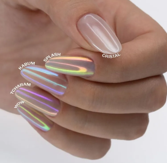 Pós cromados com reflexos multicoloridos e efeito espelhado. Com textura fina, o produto fica completamente nivelado quando aplicado. O Kit contém 4 cores com fundos e reflexos diferentes para te entregar muitas opções em mesa.